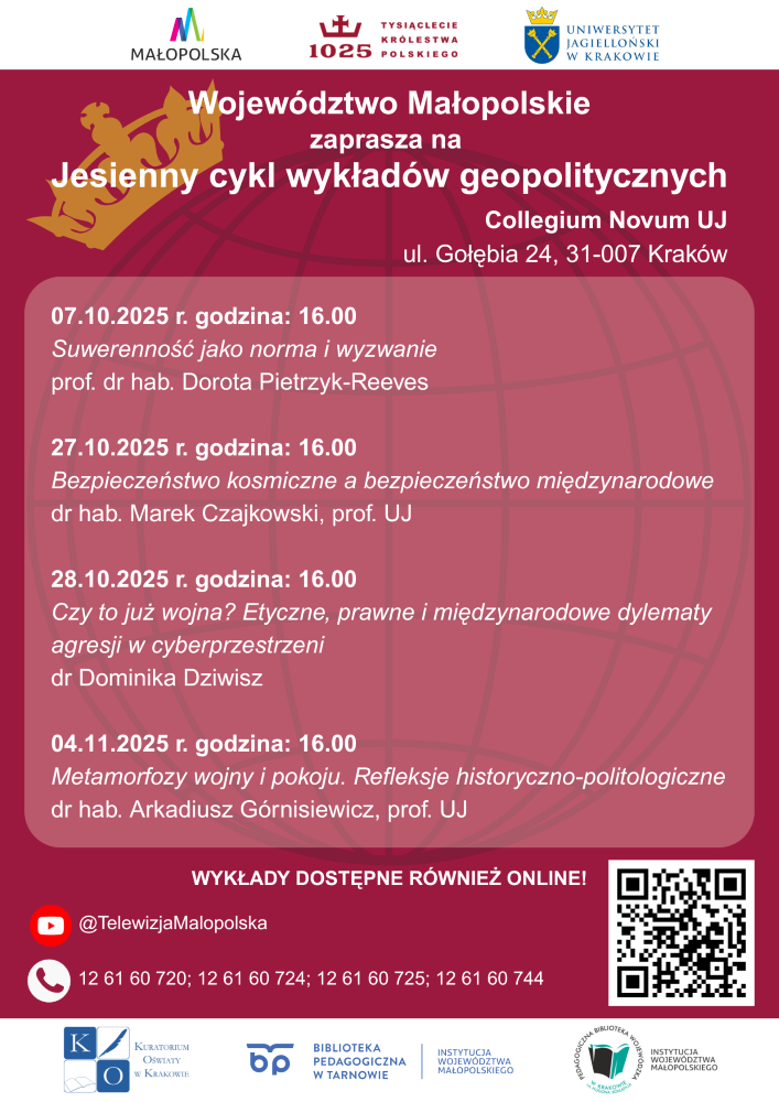Jesienią Małopolanie będą mogli uczestniczyć w wyjątkowym cyklu wykładów poświęconych geopolityce i wyzwaniom stojącym przed współczesnym światem. Inicjatywa realizowana jest przez Departament Edukacji Urzędu Marszałkowskiego Województwa Małopolskiego we współpracy z Pedagogiczną Biblioteką Wojewódzką w Krakowie, Biblioteką Pedagogiczną w Tarnowie oraz Uniwersytetem Jagiellońskim.