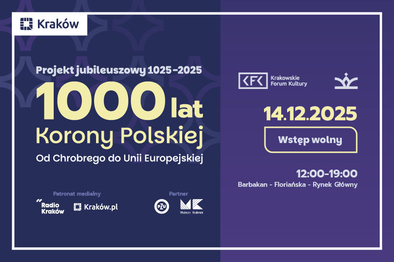 Krakowskie Forum Kultury zaprasza na nadzwyczajny dzień poświęcony tysiącleciu Korony Polskiej. Wydarzenie zainaugurują warsztaty w Barbakanie – przestrzeni twórczych działań i inspiracji. Następnie barwny korowód prowadzony przez Scenę Kalejdoskop przejdzie na Rynek Główny, gdzie czekać będą wzbogacone wizualizacjami koncerty artystów sceny elektronicznej nieskrępowanie przetwarzających etniczne brzmienia.