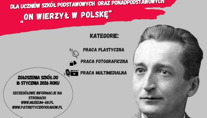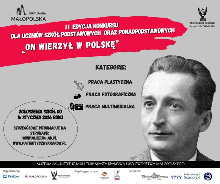 Od 31 października 2025 roku rusza II edycja wojewódzkiego konkursu “On wierzył w Polskę”, poświęconego pamięci generała brygady Augusta Emila Fieldorfa “Nila” – wybitnego żołnierza, dowódcy Armii Krajowej, niezłomnego patrioty, który całe życie poświęcił służbie Ojczyźnie.