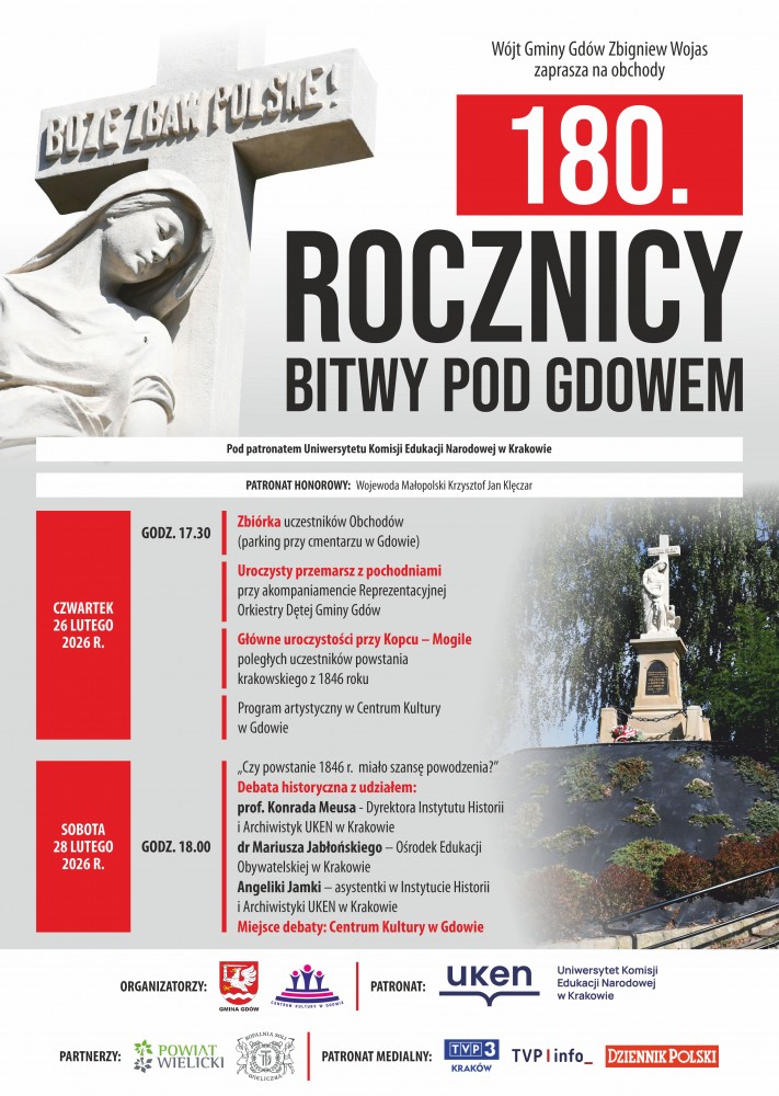 26 lutego 2026r. Wójt Gminy Gdów Zbigniew Wojas zaprasza do udziału w obchodach, których celem jest upamiętnienie  poległych powstańców z 1846 roku, ale też refleksja nad tragiczną historią powstania krakowskiego i bitwy pod Gdowem.