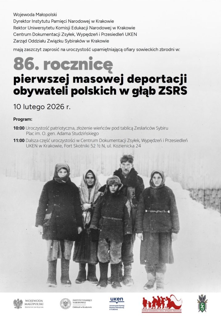 Na pl. o. Studzińskiego w Krakowie oraz w Forcie Skotniki 10 lutego 2026 r. odbędą się uroczystości w 86. rocznicę pierwszej masowej deportacji obywateli polskich w głąb Związku Sowieckiego.
